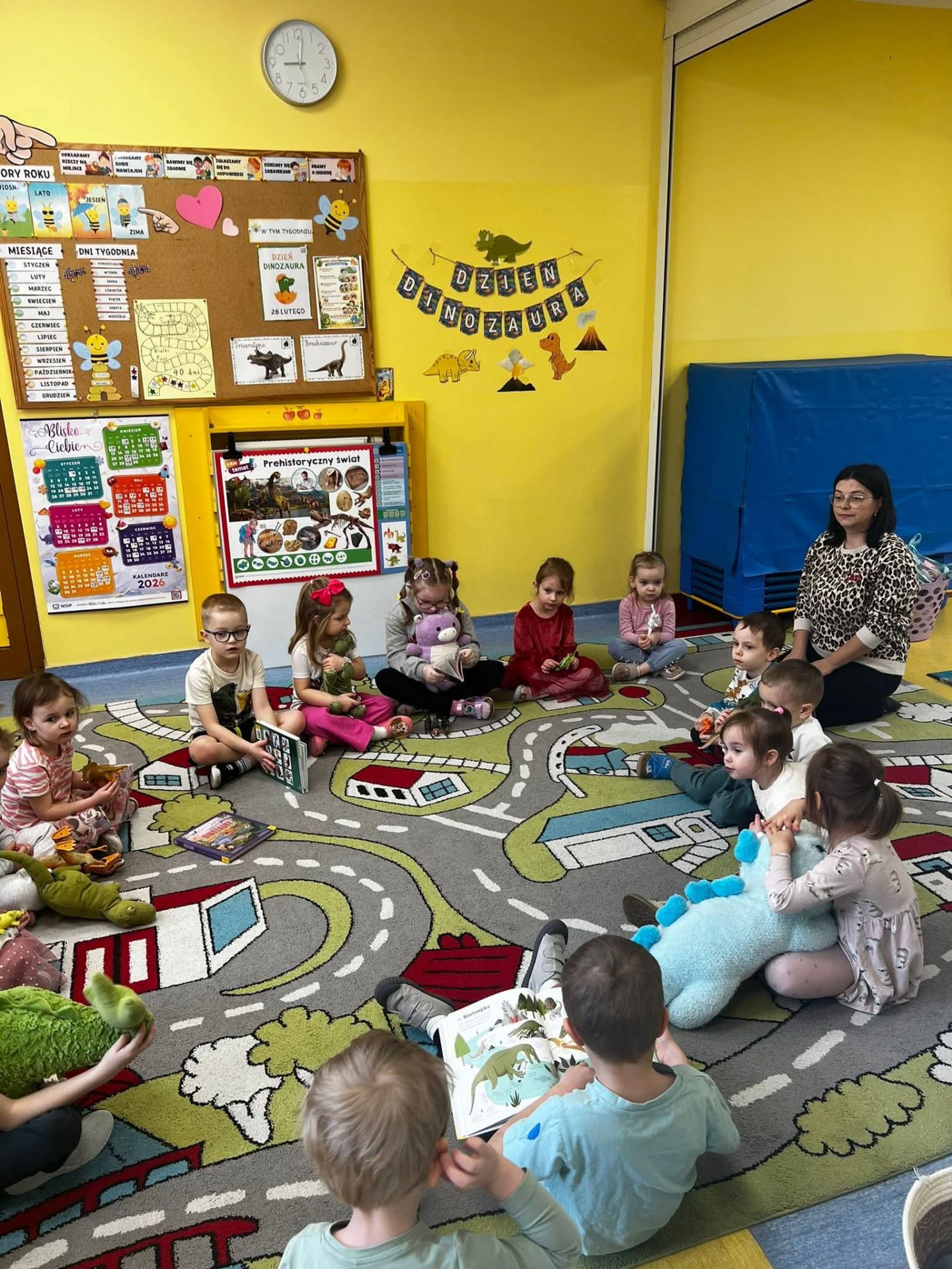 Dzisiaj przedszkolaki świętowały Dzień Dinozaura, przynosząc z domu swoje ulubione figurki i pluszowe dinozaury. Każde dziecko miało okazję zaprezentować swojego prehistorycznego przyjaciela i podzielić się ciekawostkami na jego temat